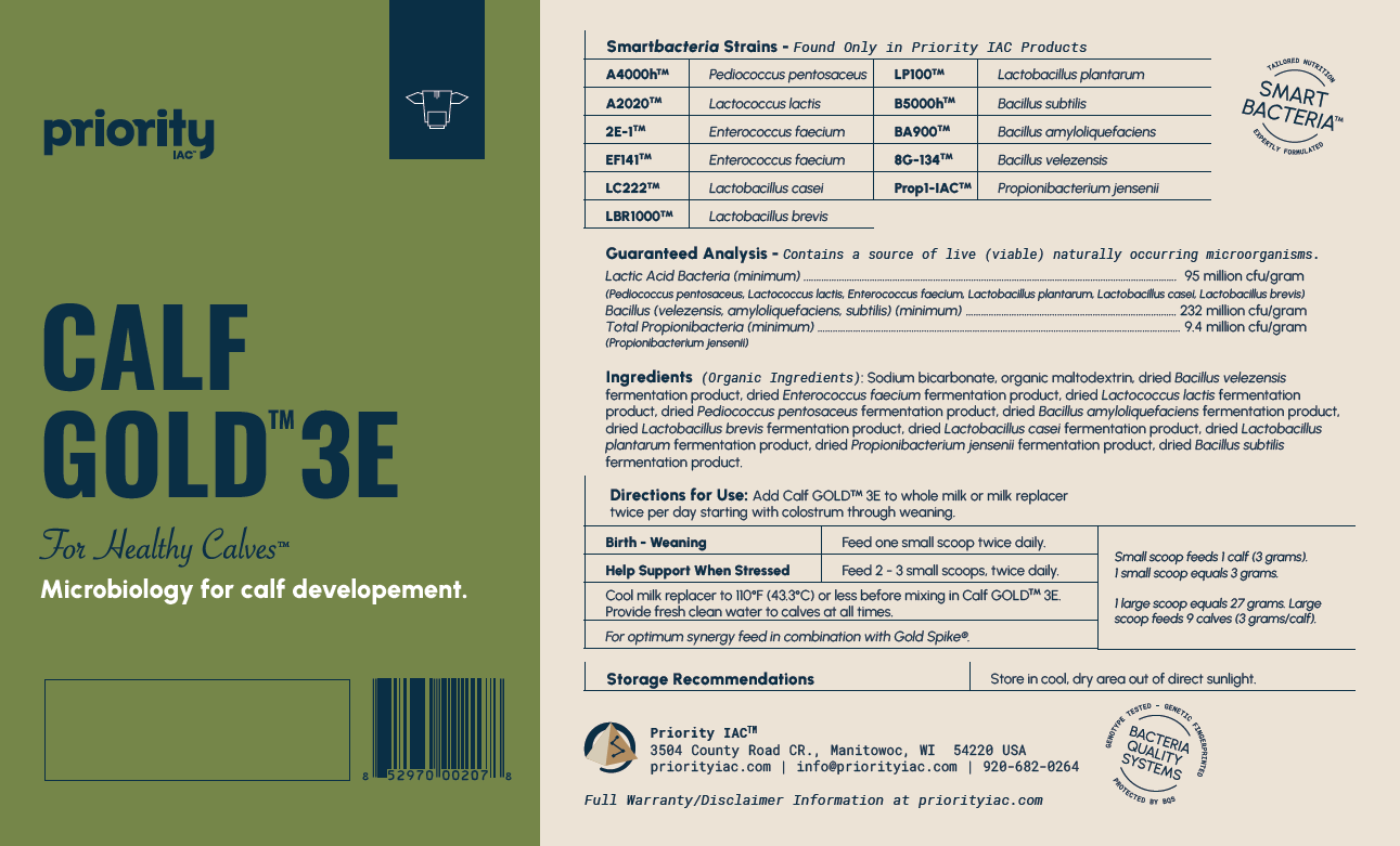 Priority IAC’s Calf Gold™ 3E is designed to be used twice daily for beef and dairy calves needing additional digestive health support through weaning. Calf Gold™ 3E can help develop calves’ rumen through specifically chosen Smartbacteria Strains, leading to effective weaning, which means calves can spend less time on milk or milk replacer.