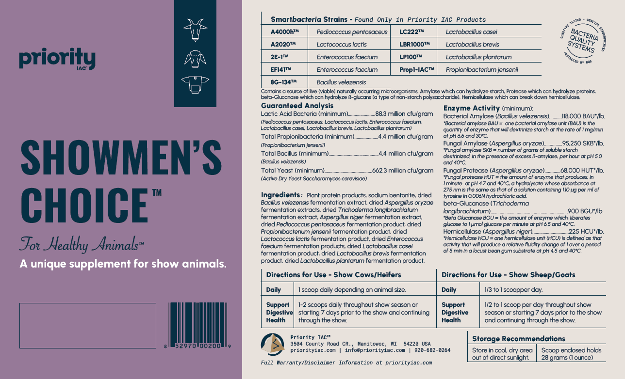 Showmen’s Choice™ for Sheep and Goats has been shown to promote a healthy digestive system for sheep and goats. It’s no secret that the stress and change of environment of showing can cause digestive issues in sheep and goats. Priority IAC’s Smart Strains™ of Smartbacteria stimulate optimum digestive performance, helping sheep and goats to have a healthy digestive system before, during, and after showing.